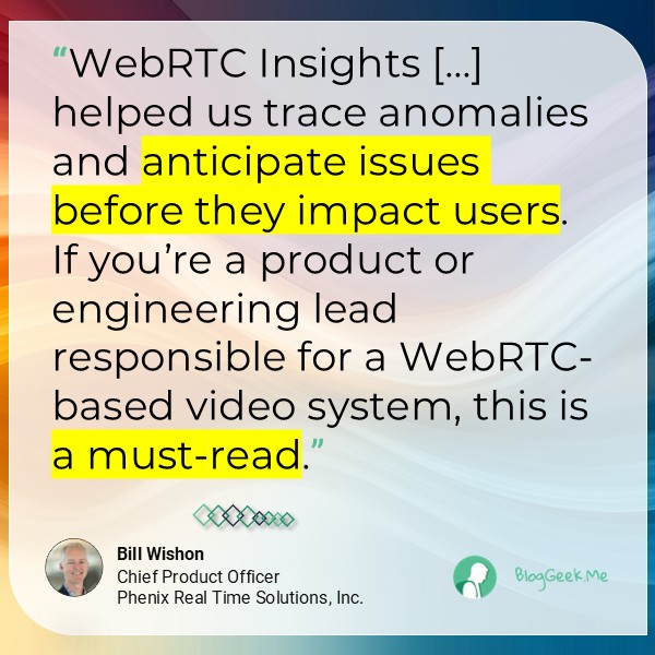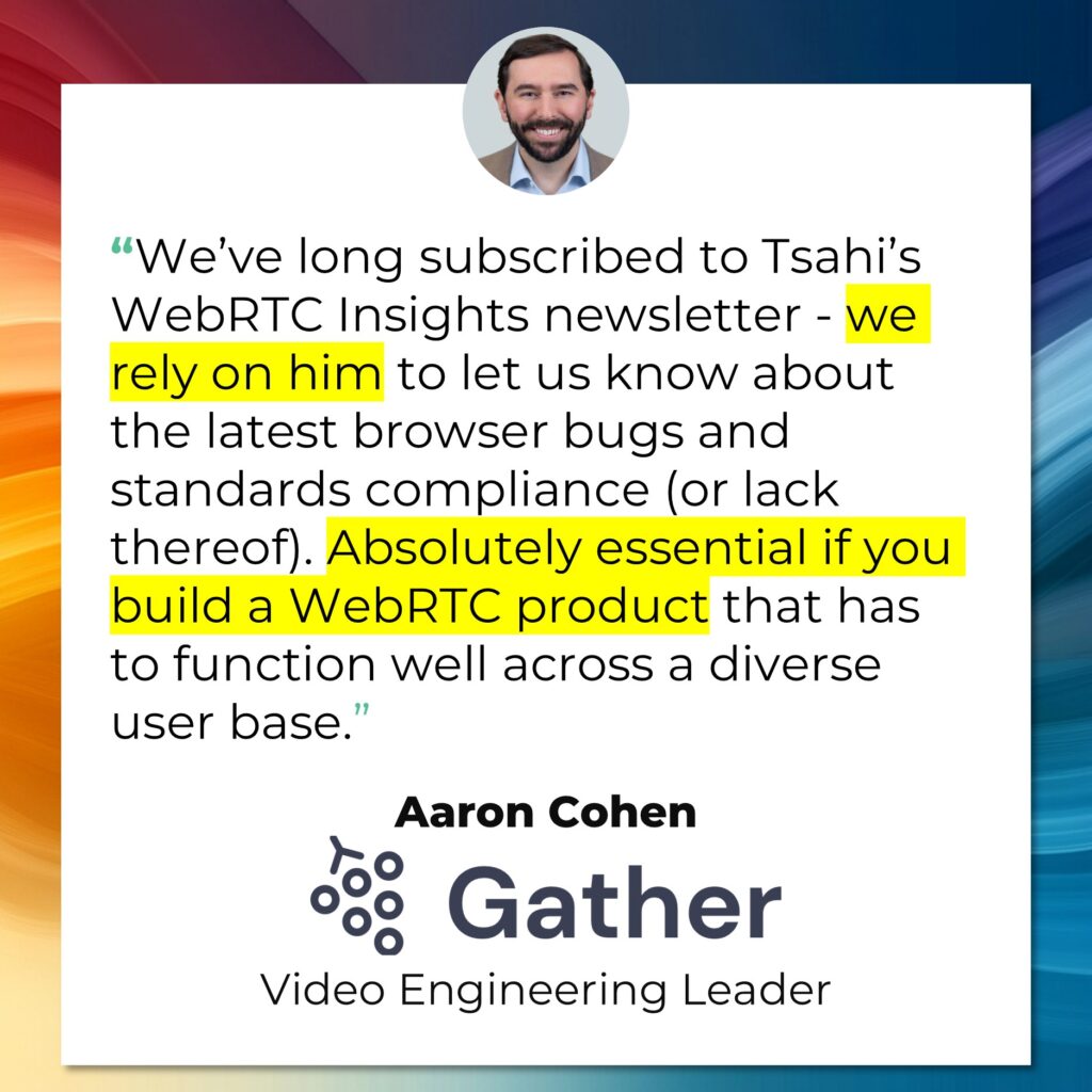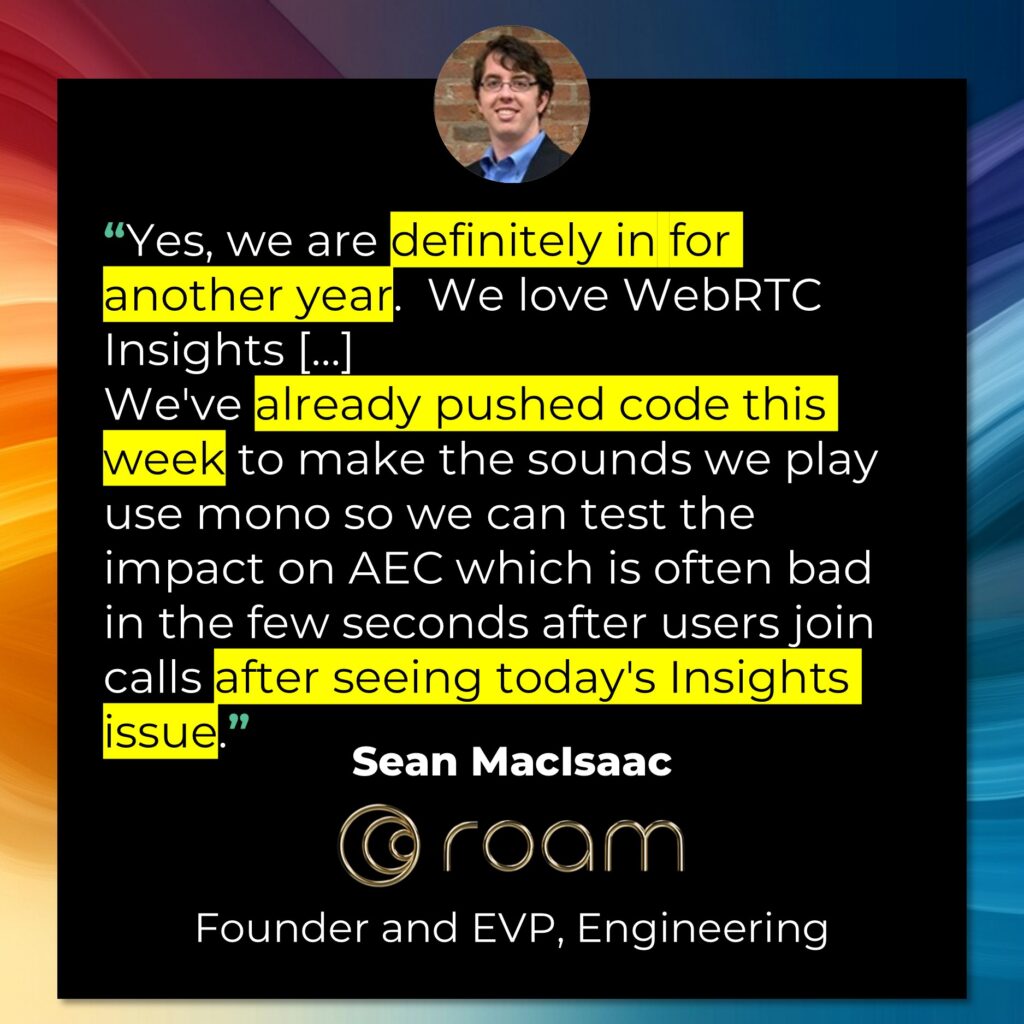 If you’re working with WebRTC and not subscribed to the WebRTC Insights yet – you need to ask yourself why it is. And if you might be interested, then let me know – and I’ll share with you a sample issue of our insights, so you can see what you’ve been missing out on.