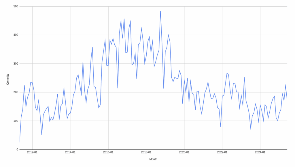 This correlates with the overall decline in the activity around libWebRTC which has dropped to a less than 200 commits per month these days: