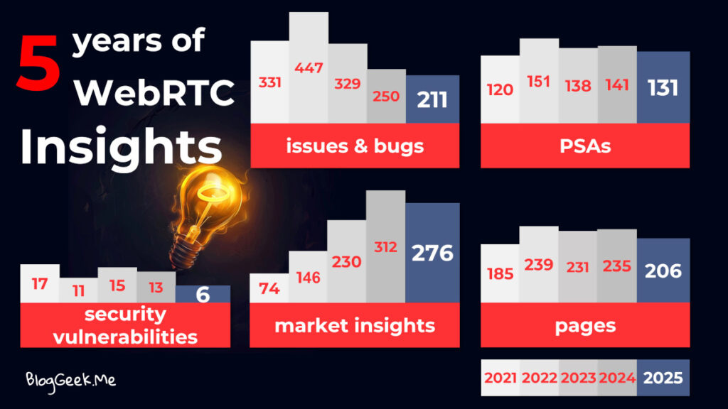 26 Insights issued this year with 211 issues & bugs, 131 PSAs, 6 security vulnerabilities, 276 market insights all totaling 206 pages. A slight decline from last year, though still quite busy for a “maintenance mode” of libWebRTC.